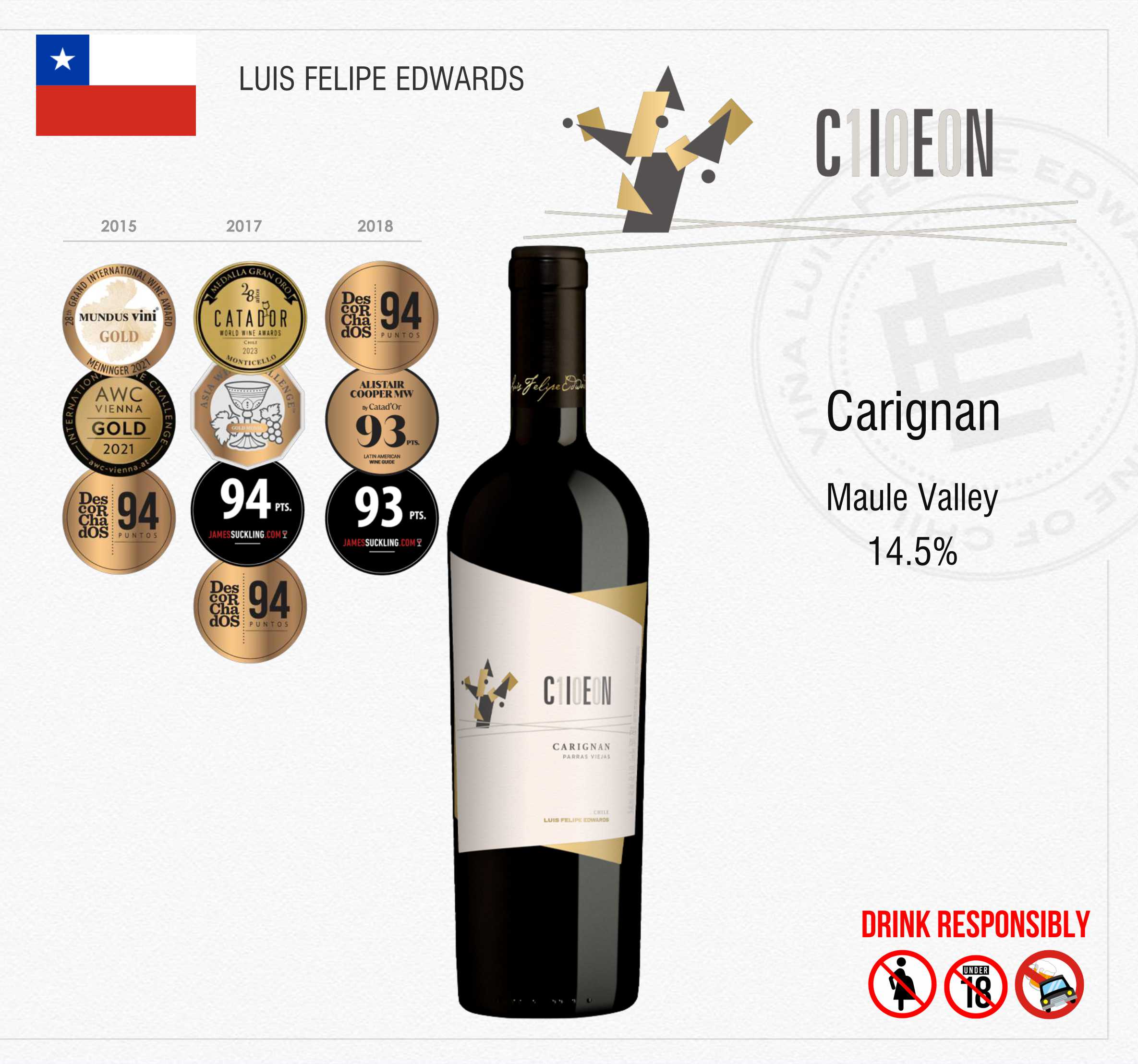 93/100 points: Tim Atkin MW - Chile Special Report 2020. Vintage 2014.